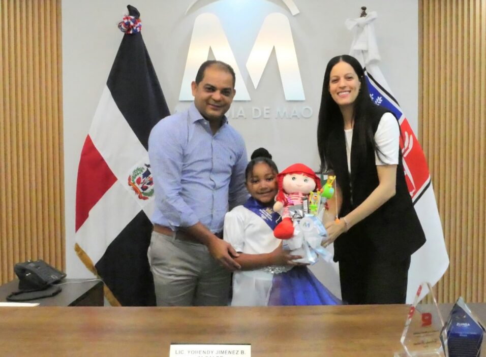 El alcalde del municipio de Mao, Yohendy Jiménez Bonilla junto a la vicealcaldesa Estefany Frías Martínez, recibió en su despacho y con entusiasmo a la niña Aubrey Amahia Marmolejos Batista, quien representará a la provincia Valverde en el certamen Miss…