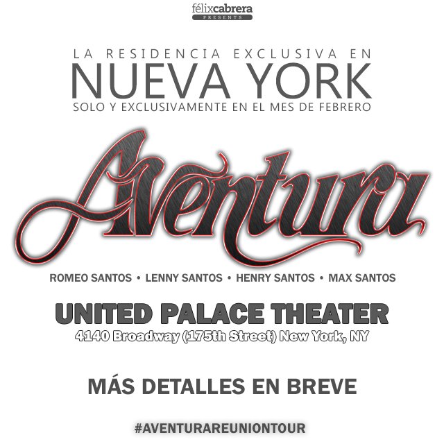 Los seguidores de Aventura podrán disfrutar una vez más de éxitos como “Los infieles” y “Obsesión” en una residencia exclusiva que la banda hará en el teatro United Palace de Nueva York durante el próximo mes de febrero.