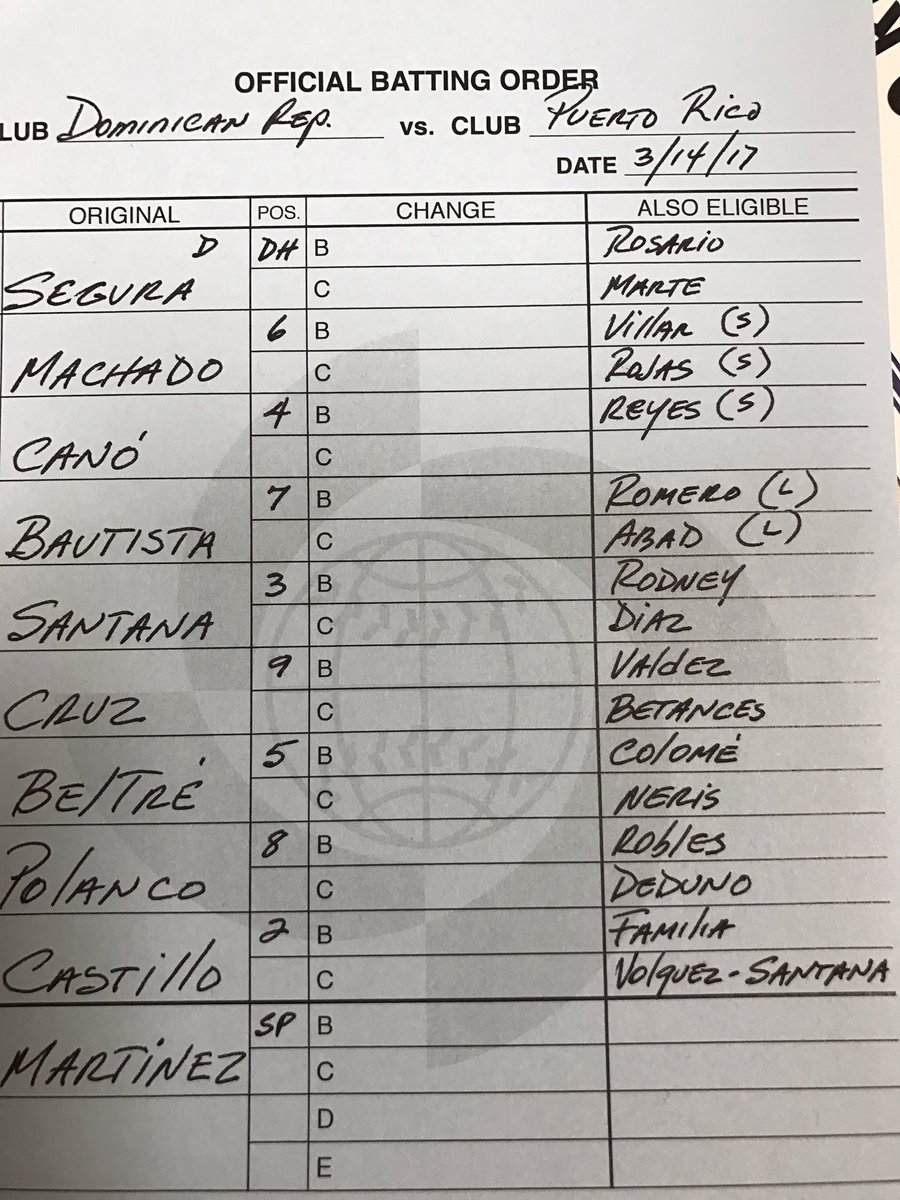 El equipo dominicano anunció esta tarde la alineación con la que enfrentará a Puerto Rico en su primer partido de la segunda ronda en el Clásico Mundial de Béisbol 2017.