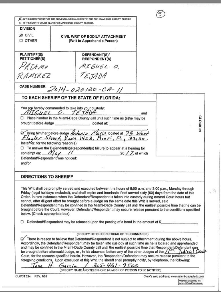 Tejada debía haberse presentado el martes a las 9:30 en la corte del Condado de Miami-Dade en el Downton para explicar por qué ha incumplido en los acuerdos del 28 de febrero del 2017.