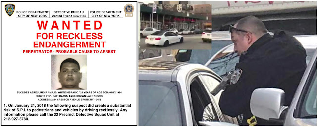 La policía, que divulgó el video del momento en que Abreu Ureña, acelera a toda velocidad, después que pistolas en manos, policías le preguntan que si es un estúpido, también publicó el afiche de búsqueda en el que ofrece una recompensa de $2.500 dólares por información el paradero del conductor dominicano y la fotografía del prófugo.