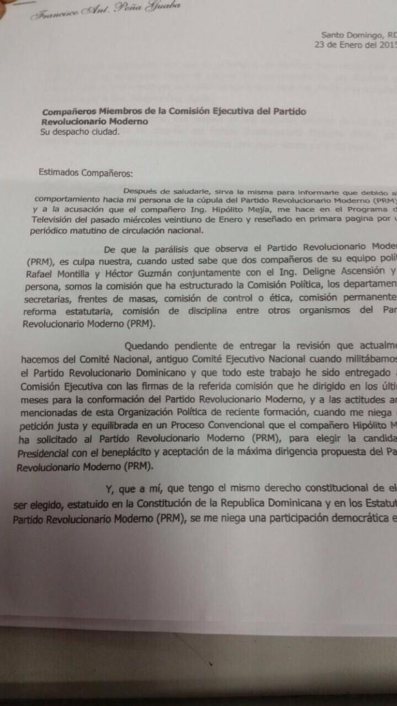 En un carta dirigida a los miembros de la Comisión Ejecutiva del PRM, así como al expresidente Hipólito Mejía y al aspirante presidencial Luis Abinader, Peña Guaba se quejó de la acusación de este último, en el sentido de que es parte de la parálisis en la conformación de los organismos del PRM, debido a sus aspiraciones a secretario general de esa organización.